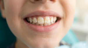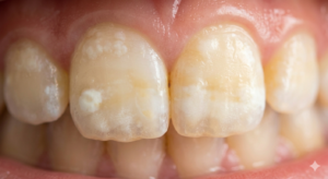• 見た目の特徴: 歯の一部が白濁していたり(ホワイトスポット)、黄色や茶色に変色していたりします。