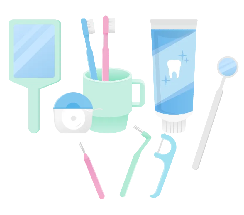 ご自宅ではご自身のお口の状況に合わせて歯ブラシ、フロス、歯間ブラシ、洗口液などを使用してケアをしましょう。